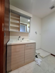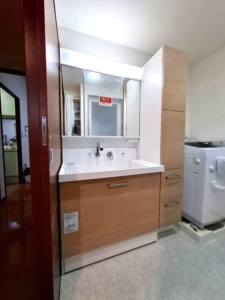 築20年のマンションにて、洗面化粧台のリフォーム工事を行いました。今回採用したのは、LIXILの人気シリーズ「ピアラ」。収納力と使いやすさを兼ね備えたモデルで、限られたスペースでも快適に使える洗面空間へと仕上がりました。本体は「ステップスライドタイプ」を採用しており、奥までしっかり使える引き出し収納で、洗剤や日用品のストック、小物類まで効率よく整理整頓が可能です。さらに特長的なのが、下部の引き出しがそのまま踏み台として使える設計になっている点です。お子様が手洗いや歯磨きをする際にも無理なく使えるため、ご家族皆様にとって使いやすい洗面空間を実現します。普段は収納として使いながら、必要な時だけ踏み台として活用できる便利な仕様です。水栓にはシングルレバーシャワー水栓を採用しており、水量や温度調整もスムーズに行えます。ホースを引き出して使えるため、ボウル内のお掃除や洗髪などにも便利で、日常の使い勝手が大きく向上します。ミラーは3面鏡(全収納タイプ)を設置し、鏡裏にしっかりと収納スペースを確保。化粧品や日用品をすっきり収納できるため、見た目もスッキリとした清潔感のある空間を維持できます。LED照明付きで、明るく見やすいのも嬉しいポイントです。さらにトールキャビネットを設置することで収納力を強化し、タオルや洗剤、着替えなどもまとめて収納可能に。洗面まわりの動線も整い、日々の使いやすさが大きく向上しました。マンションの洗面リフォームでは、限られた空間を有効活用することが重要です。今回のように機能性と収納力、さらに使いやすさを兼ね備えた設備を選ぶことで、より快適な住まいづくりにつながります。洗面化粧台の交換やリフォームをご検討の際は、ぜひトラストホームにご相談ください。