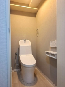 築30年のマンションにてトイレリフォーム工事を行いました。今回採用したのは、TOTOのウォシュレット一体形便器「ZR」と、棚付き二連紙巻器「CF-AA64/WA」です。設備の交換とアクセサリーの見直しにより、使いやすさと清潔感を兼ね備えたトイレ空間へと仕上がりました。ZRシリーズは、タンクとウォシュレットが一体となったすっきりとしたデザインが特長で、凹凸が少なくお掃除がしやすい仕様です。コンパクトな設計により、限られたマンションのトイレスペースでも圧迫感を軽減し、空間を広く見せる効果があります。また、節水性能にも優れており、日々の水道使用量を抑えながら快適に使用できる点も魅力です。さらに、フチなし形状により汚れが溜まりにくく、サッと拭くだけでお手入れができるため、日常の掃除の負担軽減にもつながります。毎日使う場所だからこそ、こうした清掃性の高さは大きなメリットです。アクセサリーには棚付き二連紙巻器を採用し、ペーパーを2つセットできることで交換の手間を軽減。さらに上部の棚はスマートフォンや小物を置くことができ、利便性も向上しています。シンプルで空間に馴染みやすいデザインもポイントです。内装も一新することで、明るく落ち着いた雰囲気のトイレ空間に仕上がり、全体の統一感が向上しました。設備と内装をトータルでリフォームすることで、見た目と使い勝手の両方を改善することができます。マンションのトイレリフォームでは、限られた空間をいかに快適にするかが重要です。トイレの交換やリフォームをご検討の際は、ぜひトラストホームにご相談ください。快適で使いやすい空間づくりをサポートいたします。